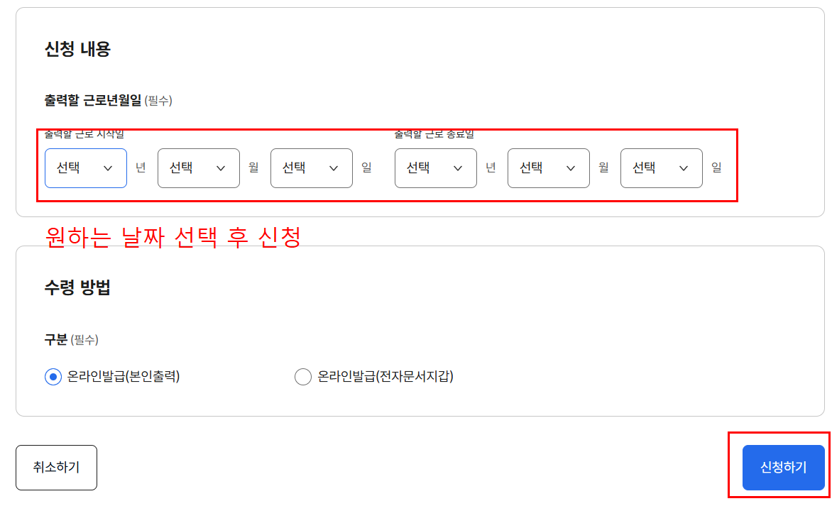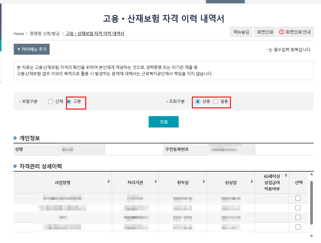 - 메뉴에서 증명원 신청/발급 → 고용·산재보험 자격이력 내역서