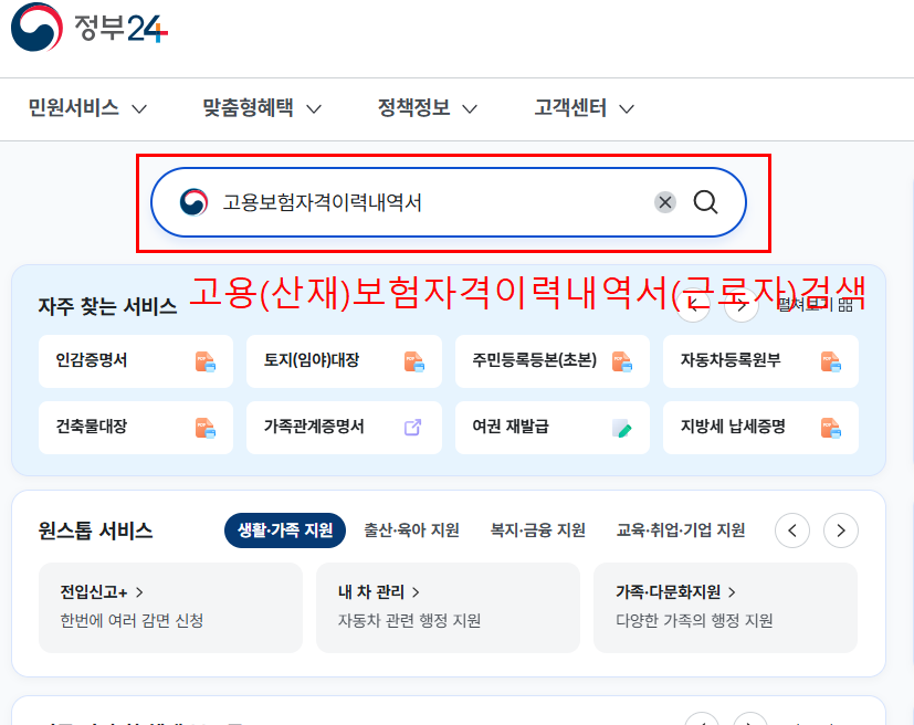 - 정부24 접속 → 검색창에 ‘고용(·산재)보험 자격이력 내역서(근로자)’ 입력