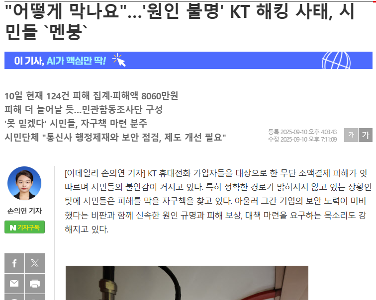 2025년 9월, KT 소액결제 해킹 피해가 전국적으로 확산되고 있습니다.
