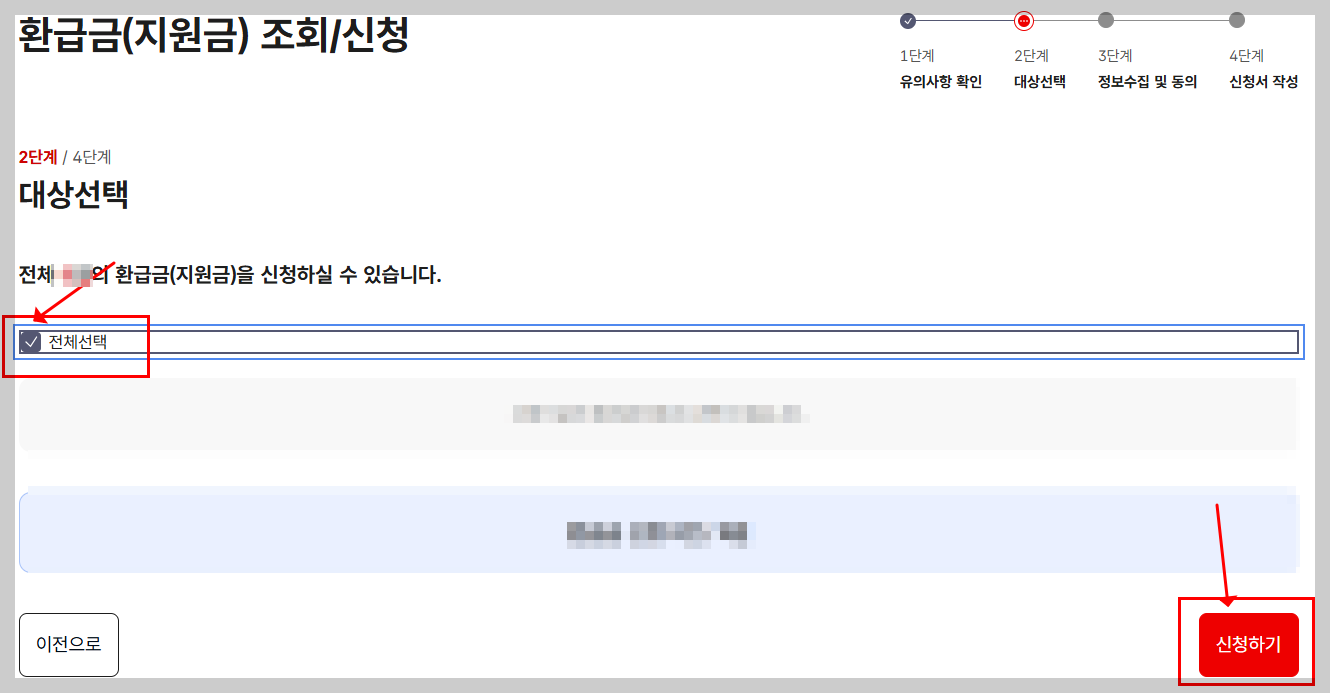 환급금조회후 선택 후 신청하기 버튼 클릭