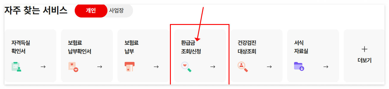 국민건강보험공단 홈페이지에 로그인 후 홈페이지 전면에 자주찾는 서비스에서 환급금 조회/신청 버튼클릭