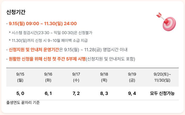 - 첫 주는 5부제: 9월 15일부터 19일까지는 출생연도 끝자리에 따라 요일별로 신청해야 해요. (예: 끝자리가 1이면 월요일)