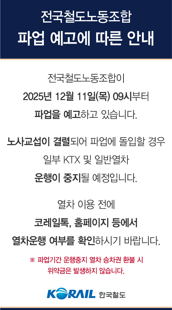 한국철도노조가 2025년 12월 11일(목) 오전 9시부터 무기한 총파업에 돌입한다고 밝히면서,